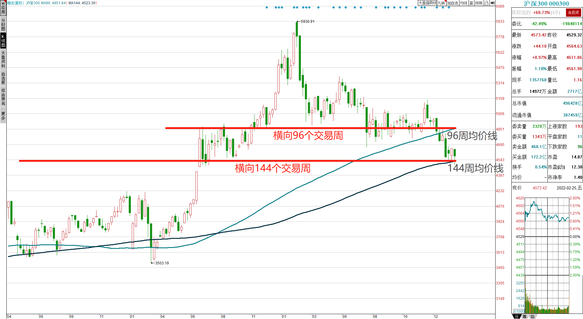 纵使我们现在仍然可以在技术上给出指数会再拉回到96周均价线之上,但显然都会在持续的下行中而减弱这样的预期。照目前的技术推演,还有10个交易周可以确判会延续96周均价线的上行态势。以当前回踩144周均价线的条件来看,的确是可以维持再反升到96周均价线之上的积极展望。