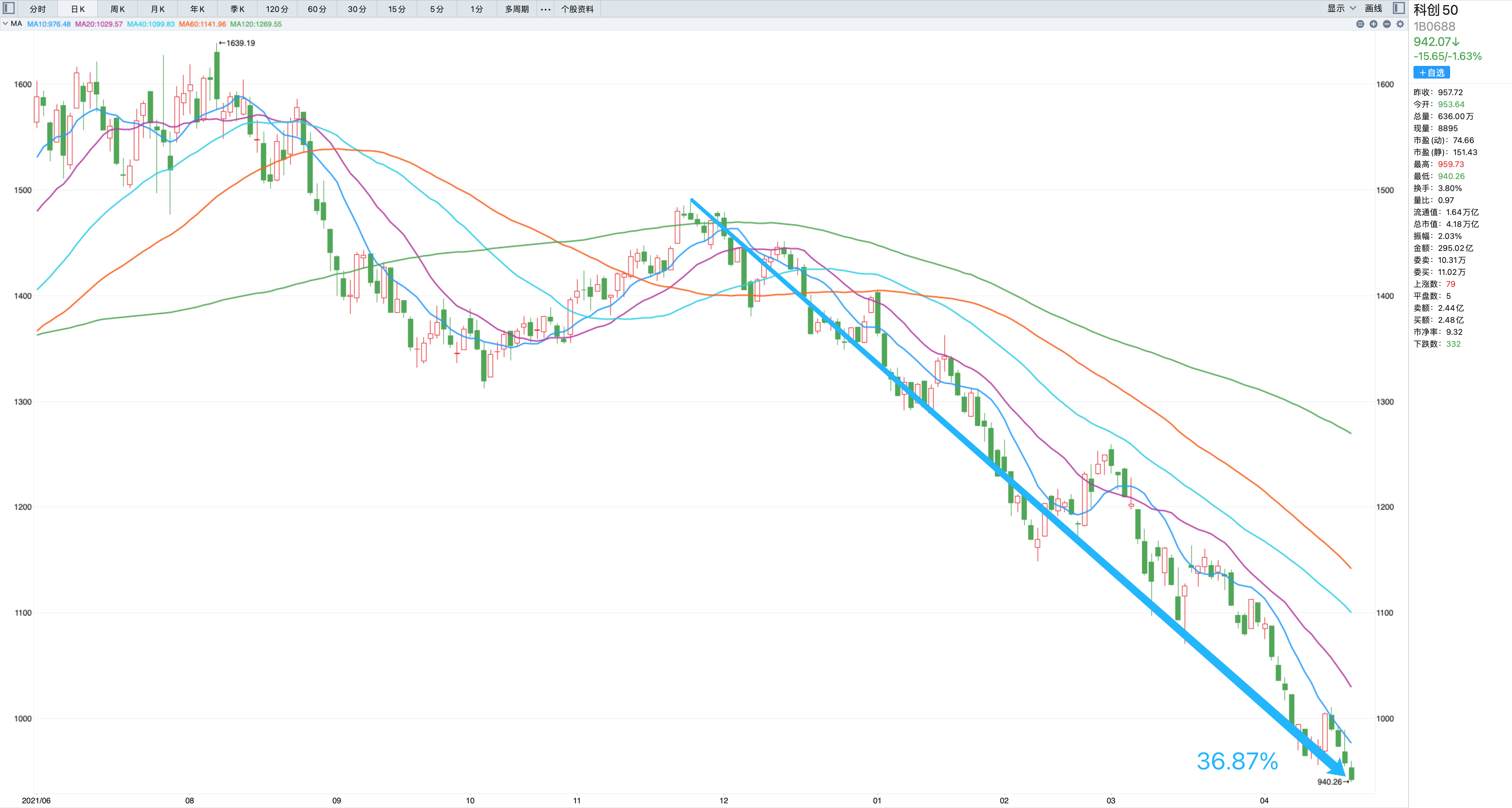 观察科创50指数的幅度,以年初至今的持续空间来看,已经超过38%,直逼40%的单边跌势,而且完成这一下跌空间的时间,仅仅100个交易日,这意味着平均日跌差不多千分之四,这速度还真的是不慢哦。