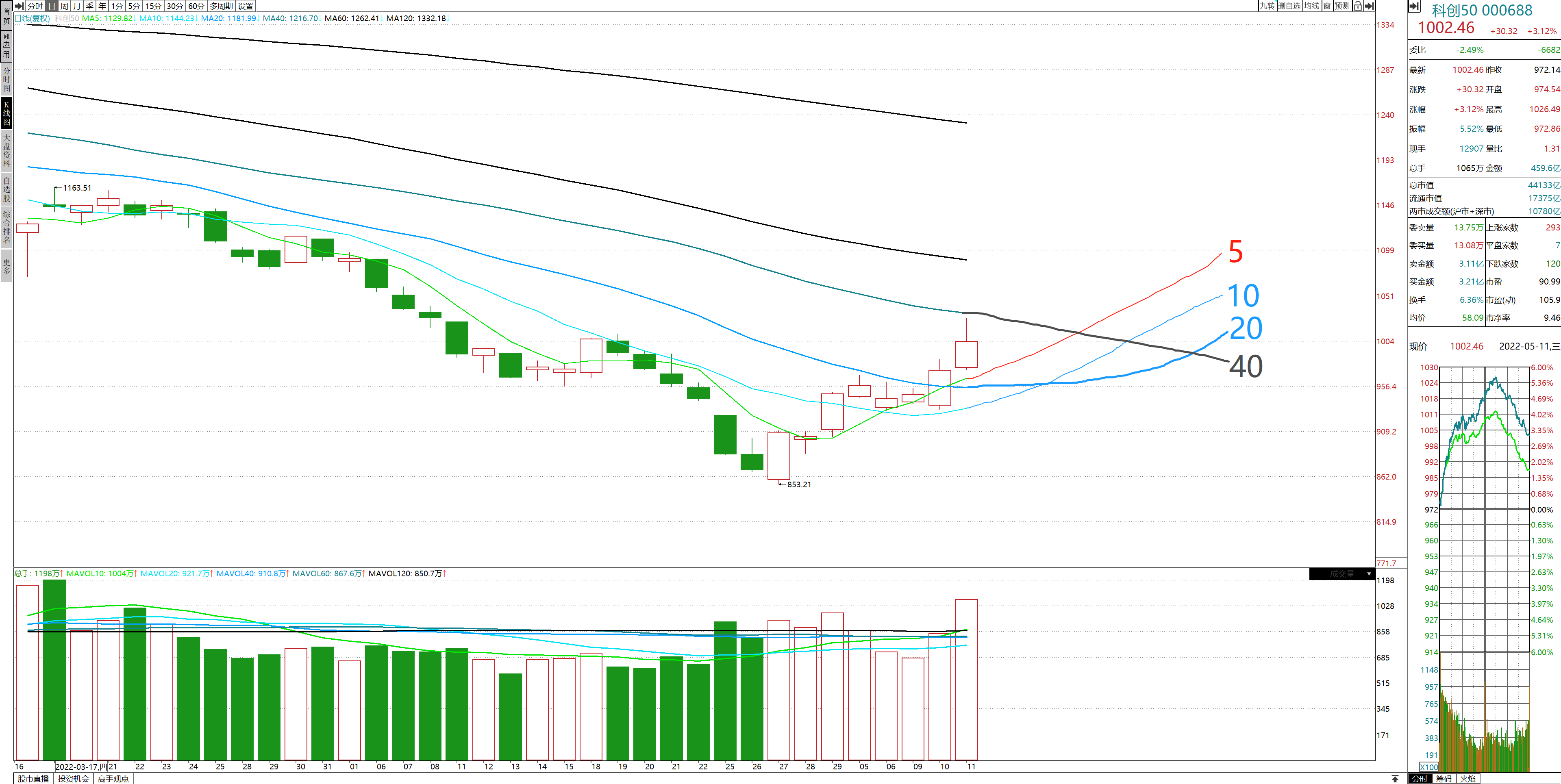 这对技术派而言,显然并非是合宜的进攻条件,但经过一周之后,持续的横向甚至小幅震荡向上拓展后,不仅能够自然实现20日周期的转变,还一并获取10日周期的涨势支持,则往上刺穿翻越40日均价线,就不是困难的事情了。这个变化,其实在科创50指数上,已经得以表现。今日的强攻一定程度上是得力于20日周期可实现低扣减而上涨的推动。按照当下条件,已经具备了翻阳上涨的基础,而且可以积极看待10、20日均价线交叉向上的支撑助涨效应。
