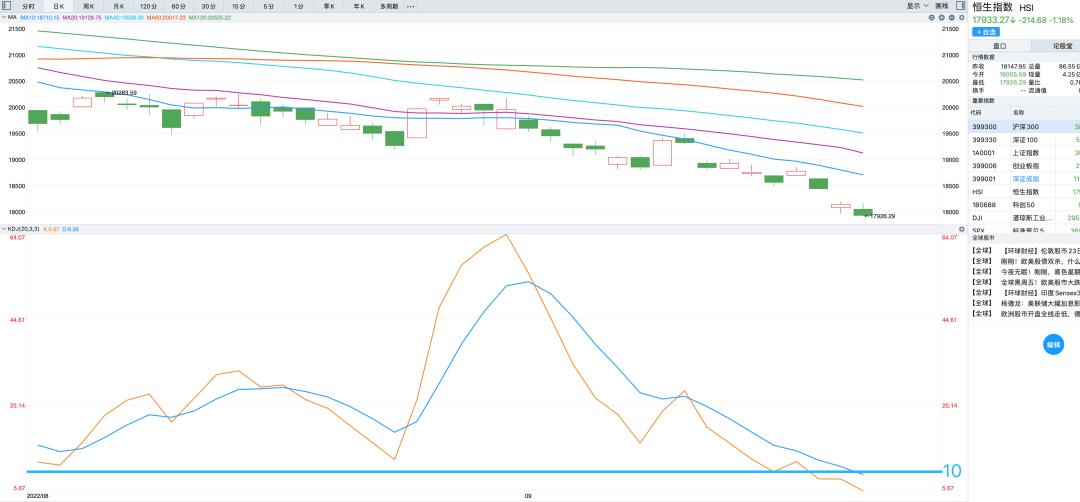 从这个角度来观察当前的道琼斯和纳斯达克指数,也都进入了技术双极值的状态,可谓同样酝酿着强而有力道的反弹行情。另外,还有恒生指数市场,也是一样的情况,随着持续的盘跌,同样进入技术双极值的技术结构。