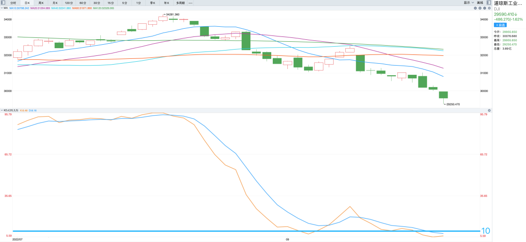 所以,对于沪深300和深圳成份指数的技术极值状态,也都具备积极看待会产生的反攻行情。基于此,同样的方法研究,我们在美股市场,也得到同样的结论,而且在道琼斯指数和纳斯达克指数上,均满足这一关系。