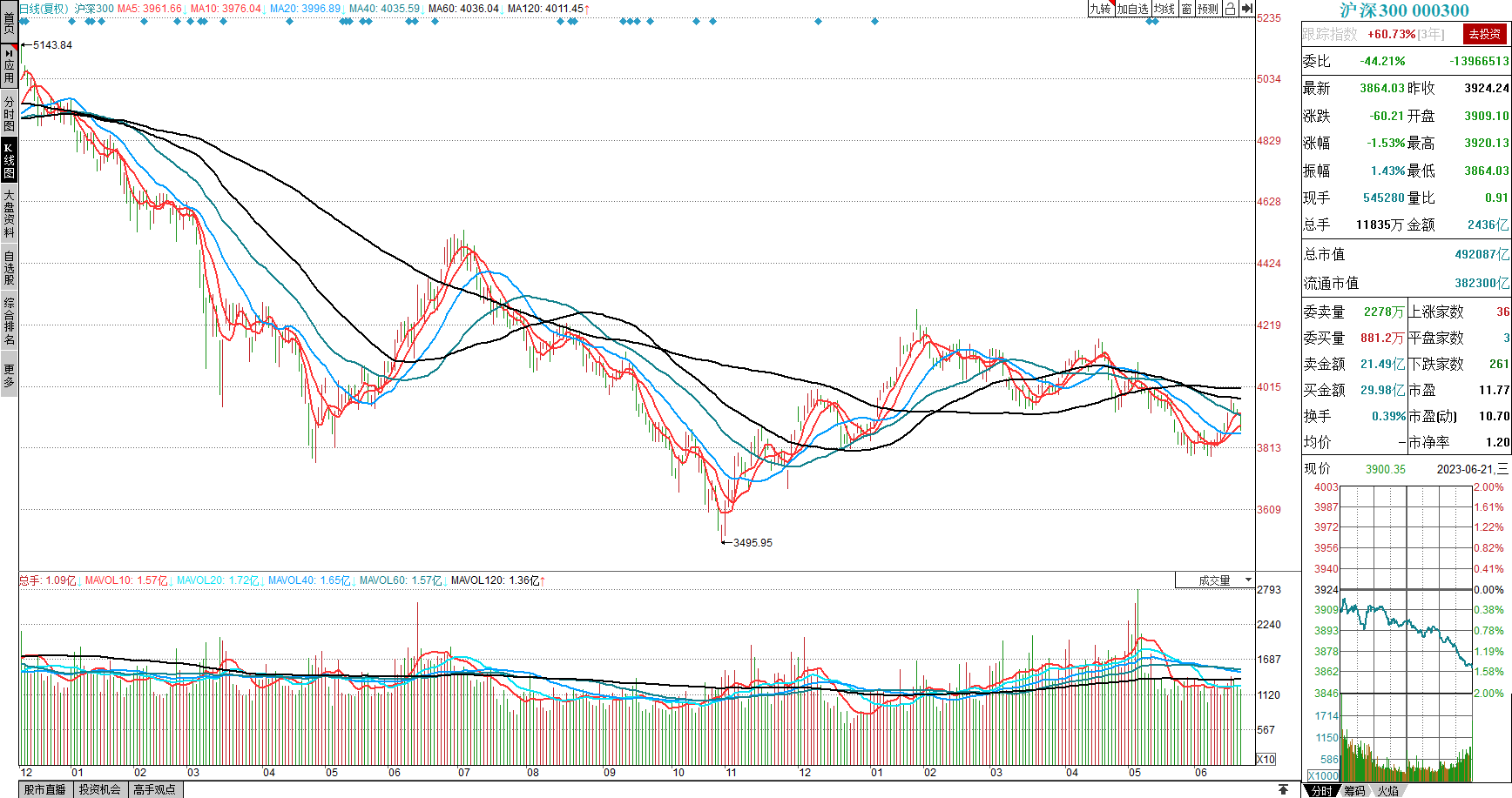 二是,俄罗斯瓦格纳事件。目前,针对此事有诸多不同的解读和说明,以及对当前俄乌局势冲突的进展推演。我们还是避开小作文不谈,而是以俄罗斯公布信息看,此事已经平息,到此为止。整件事情来看,确实扑朔迷离,如风亦如电。不过,虽然此次事件在不足24小时内得以遏制,未扩大事件的冲击,但这会否影响后续俄乌战事走向,的确是我们还需要持续关注的。关键之处,是其对我们的映射效应,至少有人在这么琢磨了。三是,关于端午节假期的消费情况。这个是需要重点思考的。以文旅部的数据来看,全国国内旅游出游1.06亿人次,同比增长32.3%,按可比口径恢复至2019年同期的112.8%;实现国内旅游收入373.10亿元,同比增长44.5%,按可比口径恢复至2019年同期的94.9%。从这些数据来看,今年端午节期间,出游人数较2019年已经创出新高,但消费总额仍然不及此前,同样出现人多钱少的消费下滑局面。这些数据在此前的多项旅游经济指标中,都有所体现。这一度成为大家作为消费降级的重要数据。的确是一个比较现实的问题,甚至今年大家发现,龙舟赛等这样的文化类活动上了头条,这在以往不多见。多少也说明在高消费奢侈类消费上,有所收敛,转而涌向文化等低消费领域。就上述各项事件来看,偏于负面一些。对A股市场的影响,都不是很友好。我们再来从技术层面推演当前A股市场的发展关系。主要是基于沪深300指数来分析研究。以当前沪深300指数的技术关系,我们维持中长期技术空头,且有序排列的下行态势。这个结构,是非常难以向上发展的,还很容易就吞噬掉任何形式的反弹成果。这在假日之前的2周里头,走势就是如此。