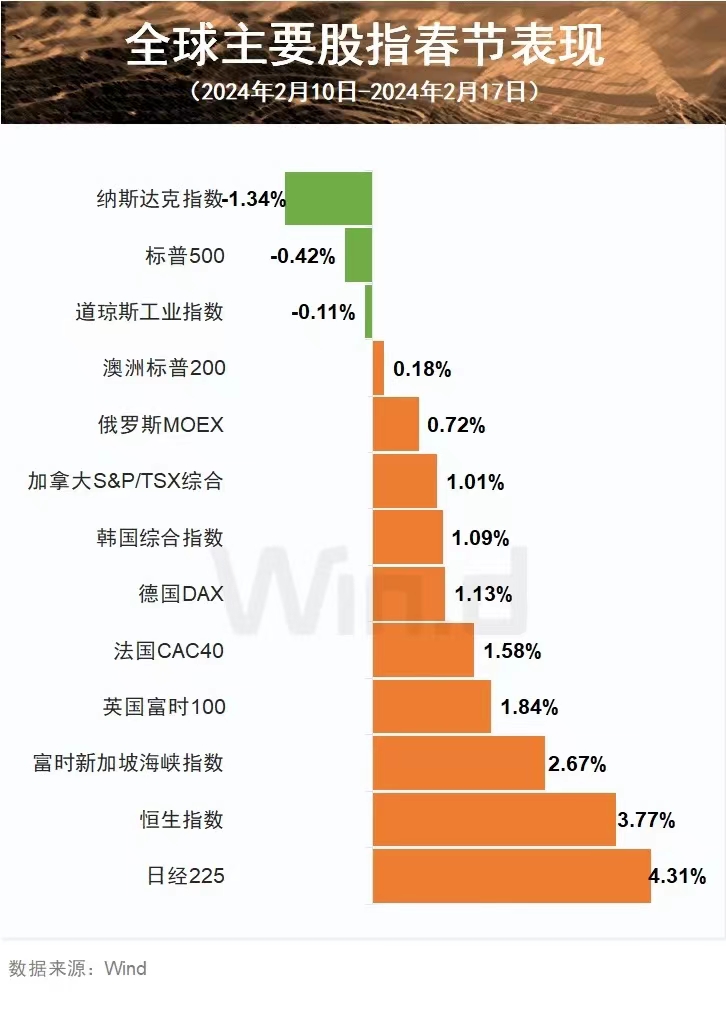 春节假日,A股休市期间,全球主要股市普遍上涨,尤其欧洲、亚太等资本市场。其中,2024年2月10-17日期间,日经225指数涨幅最高达4.31%,恒生指数涨幅次之,为3.77%。