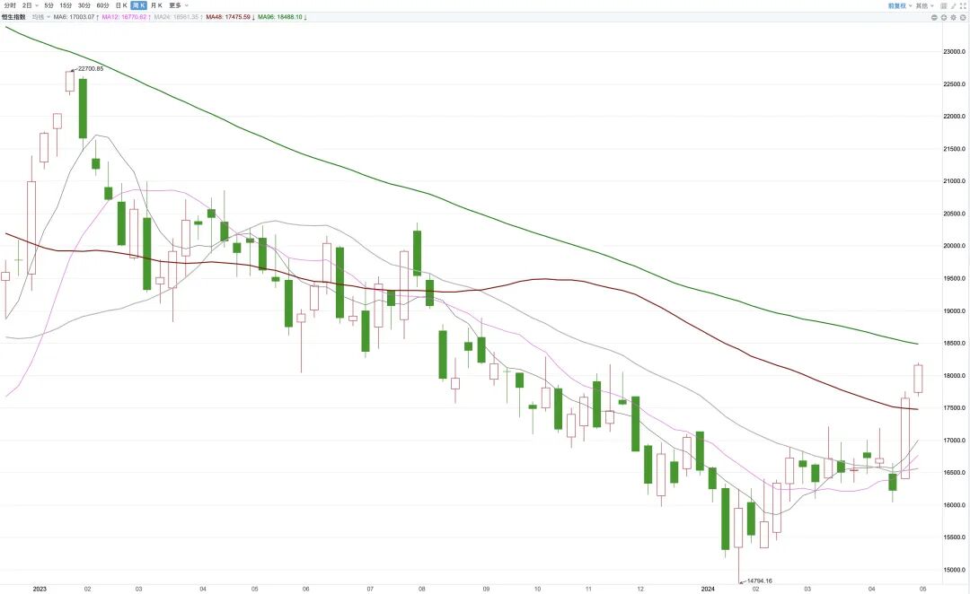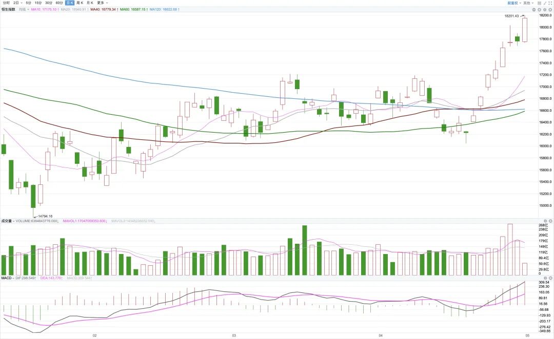 今日A股继续休市,港股复市交易。恒生指数开盘后向上狂奔,展现出势不可挡的市场力道。技术上看,自4月下旬以来,恒生指数一路上行,至今不足2周的交易时间,已经将恒生指数抬升1成以上,无论在时间和空间上,都算是十分强劲有力的反攻行情。且今日力度强劲,已经将指数向上翻越过去年第三季度修整平台上轨,有技术性突围的强力发展势头。这的确是比较能够给投资者带来积极的正向引导效应,对行情持续向上拓进,并夯实短中期技术优势,从而协同推动长期趋势性行情的发展,都带来积极预期。
