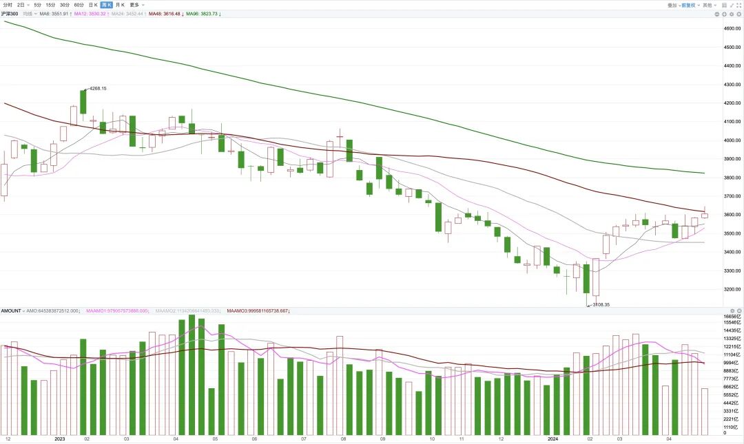 这在日K线结构上的势头显著,不过,周K线的结构也面临着我们此前在A股市场同样的技术矛盾。由于即便如此强劲的日K线发展态势,但仍然不能实现周K线长周期趋势性跌势的扭转。依照当前移动关系,48、96周均价线都还会持续向下移动。