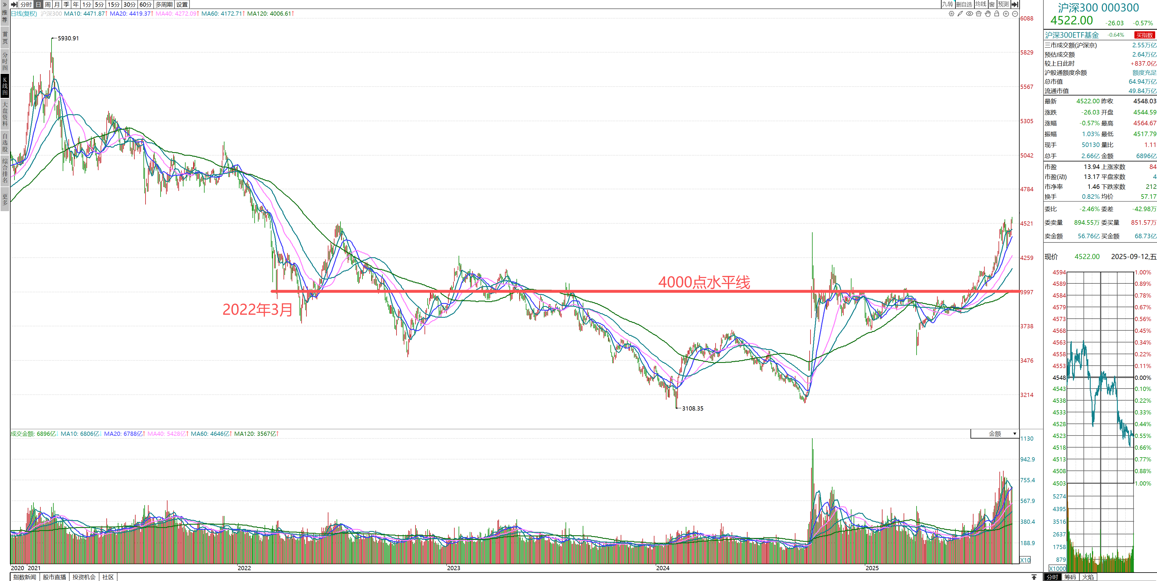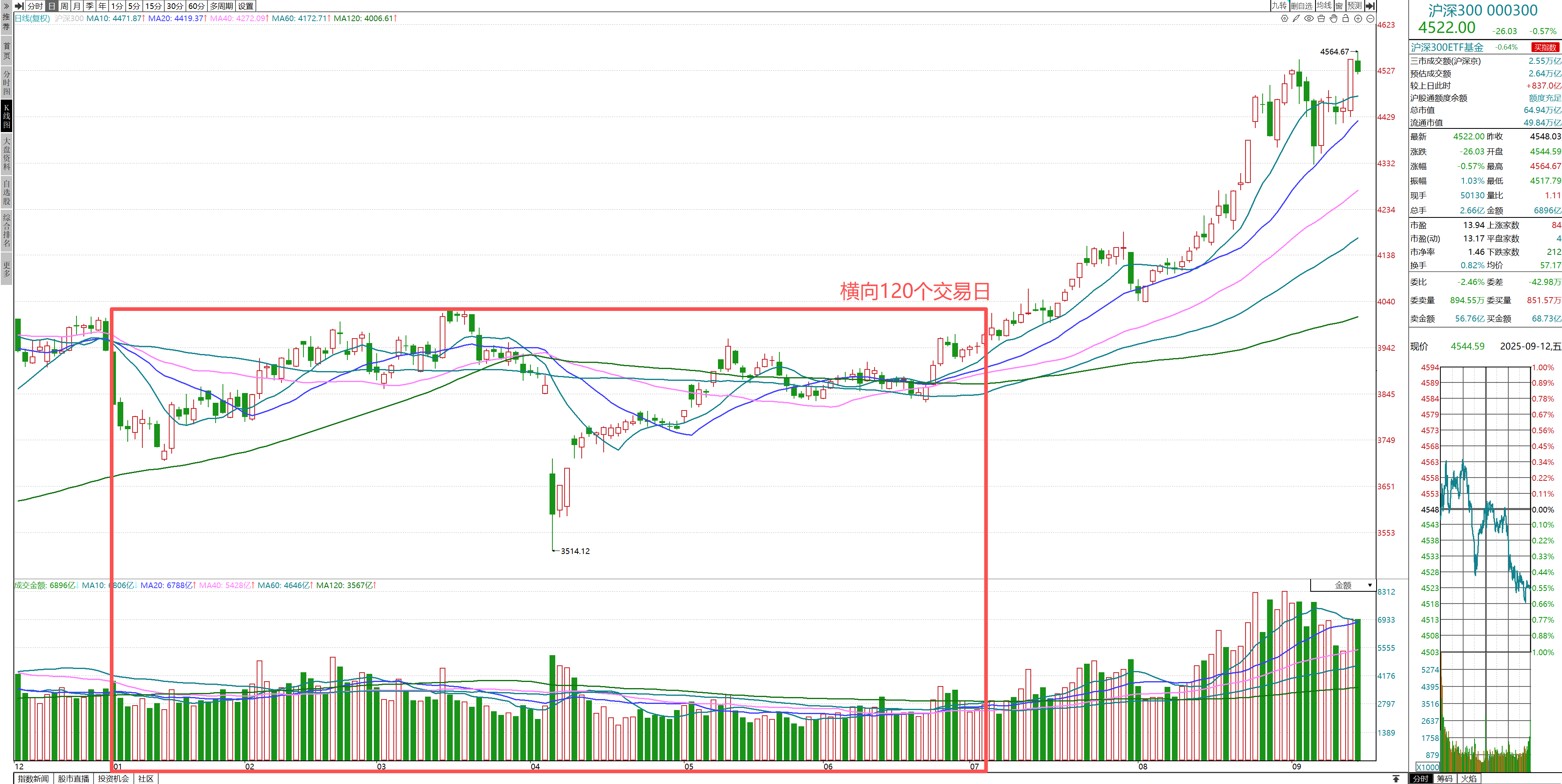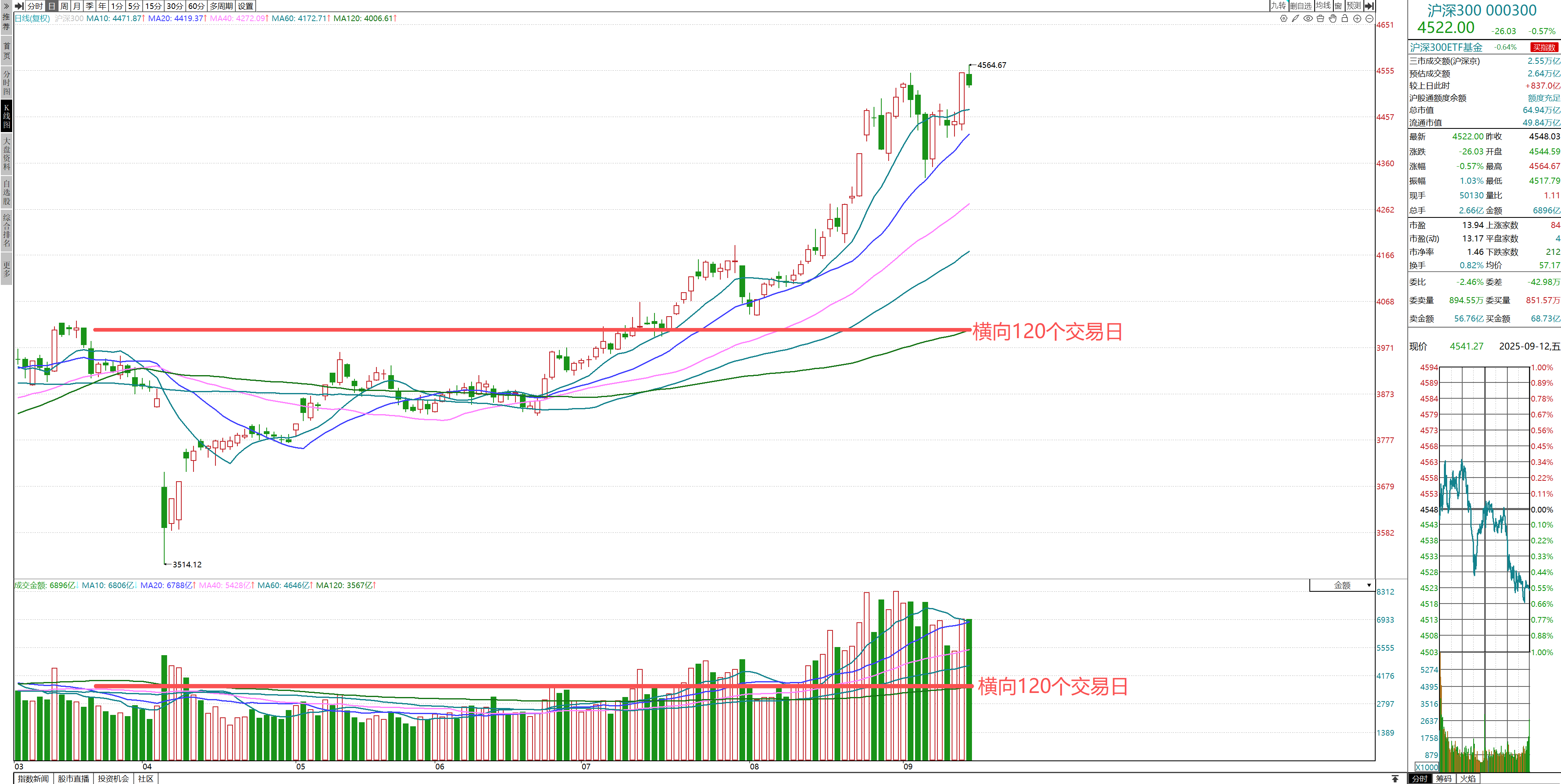 行情会以怎样的方式呈现,其实都是走过后,回头看,才是一清二楚的。在一个充满着无数的变化和各种可能性的股票市场里头,最好能够主动地积极地平滑微观波动,顺应宏观大趋势,才能够以不变应万变。就技术角度而言,沪深300指数自2022年3月跌穿4000点以后,反复多次穿梭于4000点上下,如今历经3年多的时间后,再将指数跃升在4000点之上,且经过近1年多的时间,反复夯实和整固,已然构建出了3年大底形态,并且有着显著的底部向上突破后抬升走趋势发展的技术态势。纯技术关系分析,我们早早就说明7月份具有向上突围后,发展日K线的有序多头涨势行情。以7月3日,向上促使120日周期扣低走高而上行后,指数持续向上拓进,扩张120日周期的绝对上涨基础,开启了长周期的涨势路径。特别是7月17日增量促使120日均量线扣低走高,经过10.95天的确立后,更是给120日周期的涨势关系,带来了长达半年之久的技术基础。通常而言,在没有出现震荡或回调,造成120日周期涨势关系转变之前,都可以保有长多涨势路径,来看待行情的演变和发展。就当下的行情发展进程,显然还处于半年周期涨势行情的早期阶段,远远不到担忧于波动会改变这一涨势关系的时候。无论是以7月3日120日均价线实现上行后持续发展的时间节点来预估,还是以7月17日实现120日均量线的涨势行为后来预判,都可以积极看待120日周期的长多涨势行情的发展态势。而且要应用这样的条件,来观察短期市场波动,以把握行情演变的节奏。以上述关系分析思考短期市场行情,微观变化如何应对,就需要有这样的宏观基础来支持,否则就很容易陷入无尽的微观变化带来的困境之中。从半年周期的宏观涨势结构中,我们恰恰更乐于见到任何形式的回调和波动行为,反而可以主动积极的寻求低接布局的投资交易安排。逻辑上来讲,回调就是买。只是要如何把握和顺应市场波动节奏,又要以怎样的仓位水平来配置仓位,还要在哪些领域作出积极的投资安排,这些都是可以基于自己的认知,来作出合理的规划。知己知彼,定然可以百战不殆。依照我们对微观和宏观结构的分析预判,仍然给出积极且大胆的判定。微观行情,唯有增量,方可解忧。但增量推升,难以持久,仍然会面临缩量调整之忧,持续推升无力,震荡滞涨依然会面临短期技术修整的需求。我们予以收敛量能,来重整短期结构的发展预期。但无惧于回撤,甚至会向下寻求较深的稳定效应,都不要担心会持续跌穿60日均价线而不回头。只有反复折腾震荡,无力维系60日周期的涨势关系,即时才会面临比较大的考验,否则敢跌落回踩或打穿60日均价线,都是大跌大买的绝佳契机。事实上,就当前中长多基础而言,仍然具有稳定于40日均价线之上的技术基础,还远远不必惧怕会持续向下回踩或打穿60日均价线,只是一旦展开20日周期的技术调整,的确也时常会出现快速打穿40日均价线,并踩到60日均价线的演变过程。所以,就短期市场调整而言,并不排除上述可能情况,但如此变化,反倒我们是鼓励大家在回踩或打穿40日均价线后,还继续往下逼近60日均价线的位置,其实已经要主动买进,甚至积极买套的交易策略了。当然,这一切都是基于不会因为回落而改变60日周期的涨势,自然也不会影响120日周期的涨势关系。而是否能够保有中长多的涨势基础,无疑,就是在量潮大小、价格高低、时间和空间关系上,保持动态的分析和研究。可以大胆分析,小心求证,但不要刻舟求剑,固守成规。建立在上述分析预判的基础之上,基于当下的时间节点,我们仍然可以积极看待未来78天的长多发展路径,但这一关系会随着时间和空间发展动态变化,需要实时分析和纠偏。由此则意味着,有望在未来4个月里头,都保有着长多的发展路径。操作上,就可以如此考量。这也意味着本年度接下来的几个月里头,都有望维持宏观涨势关系。那么后续的行情发展,是持续延展当前的市场热点,还是会随着时间发展出新的炒作方向,又会在第四季度及年末出现怎样的市场投资预期,都是可以早早思考和作出自我认知的预判。以我们当下对市场的观察,仍然会偏于科技成长领域,尤其是围绕AI领域的投资,会持续保有高人气效应,特别是在AI应用领域有望得到扩散。而随着时间逼向年末,资金也会自然的偏向业绩驱动的发展逻辑,对于蓝筹类高分红类的股票,都有望获得资金青睐。另外,随着美联储降息开启,会持续影响全球资本对人民币资产的吸引力,也会形成通胀的投资预期。这在资源上,已经形成资金的共识,仍然具有持续的投资参与条件。同样是往业绩驱动及全球资本共识方面考虑,对于白马类股票,也可以积极观察配置条件。总之,短震长多。无忧于市场波动,但应管理个人投资交易节奏,应对跌宕和潜在超预期的个体风险。投资方向,持续聚焦科技成长、资源有色、金融白马等多领域的投资机遇,越是往年末发展,越要增强业绩驱动逻辑,并积极寻求构建组合配置关系。具体到个股的选择和操作上,始终要明白,不和跌势股为伍,不拿垃圾股,不玩题材,不玩概念,不听消息,不要幻想,遵循“周线为主,唯量是问,四个条件,趋势为王,汰弱留强,每日归零”的原则,来审视和积极应对市场的变化与发展。