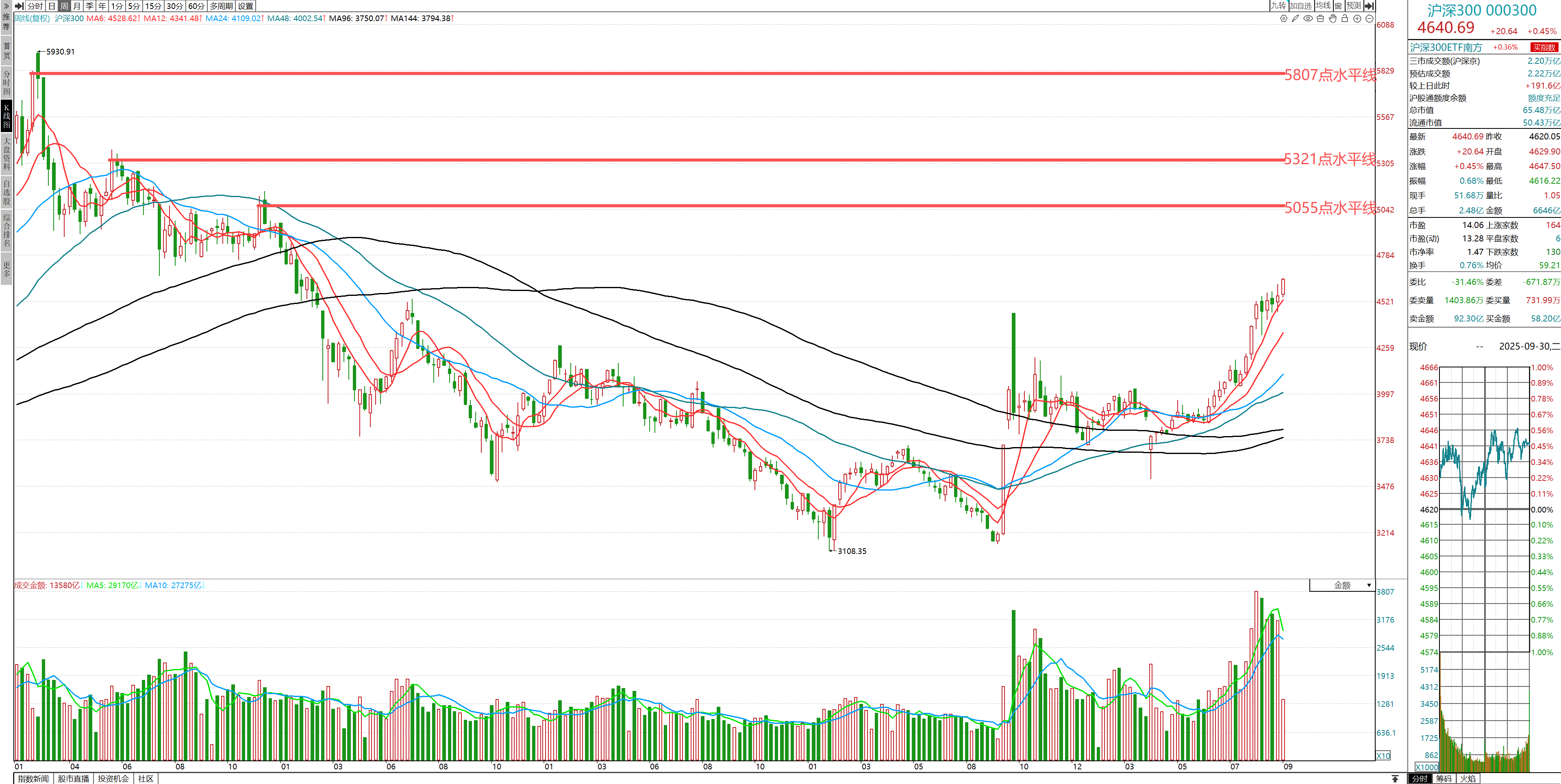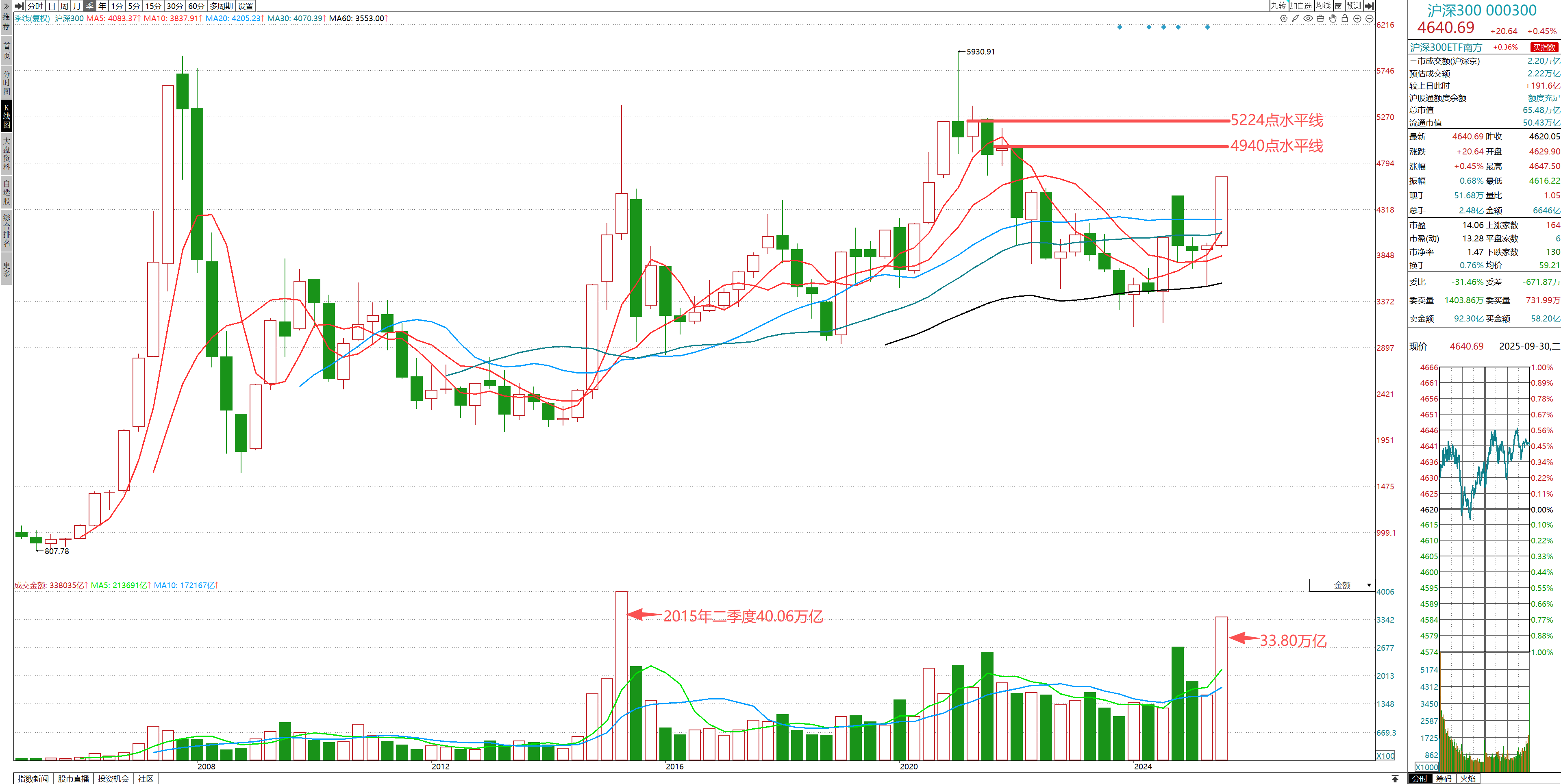 沪深300指数,3季度大涨704.61点,涨幅高达17.90%,成交总金额达到33.80万亿元,仅次于2015年2季度40.06万亿元的历史最高单季成交金额。量增价涨,大盘呈现较强劲的发展势头。就技术视角来看季度K线的结构和发展,在指数向上越过4485点一线后,在4500点处震荡夯实,并酝酿促成单季度大量长阳的K线形体,给后续行情发展,带来了极大的想象空间。按照K线组合关系及其发展预期,有望继续向上挑战2021年的技术性高点位置。以K线结构看,其关键转折点表现在4940点和5224点。考虑市场的随机性变化特点,4940-5224点的区域,就是季度K线结构上下一个的技术性的挑战区域。当然,不要刻舟求剑,凡事无绝对,时间会改变一切,通常我们在进行上述分析推演判定的,都主要是第一次亲密接触时的技术关系及市场演变规律,而非铜墙铁壁,不可逾越,亦或必然到达此处。一定要动态纠偏,顺应市场,跟随趋势。而且季度K线,属于宏观技术范畴,一根K线历经3个月才能完成,在这个期间里头,往往还嵌套着许许多多个小的技术高低转折区域,甚至更微观的行情波动。比如同样的分析方法模式,我们会考虑月K线在4940点处的较强烈的技术阻力,主要思考的点是在于这一区域近半年的平台区域告破后引发较大力度的下跌,这是一个显著的多空趋势的转折区域,往往都会成为后续行情上升过程中的技术性障碍位置。所以,就月K线结构观察,4940点会成为月K线结构上较大的阻力位置,这使得接续的行情发展中,不得不考虑这一位置构成的制约和影响。一旦震荡拓进翻越这一位置,则有望向上进发挑战5351点的月k线最高收盘点位。但基于月K线的技术结构特征,大概率是会在4940点一线争斗一番。再看周K线结构,则表现在5055-5321点区域,这会是当前周K线持续发挥趋势性涨势行情过程中,较容易遇到的技术阻力区域。能否挑战5807点或者翻阅5930点的历史性高点,也得看在上述区域处的震荡整固的情况。就月、周K线的结构,就有着比较多的小的区间关系会影响后续行情变化。不过,都反映出相对较长周期的技术阻碍位置要高到4940点及以上区域,这无疑给出了4季度的股市行情,有望震荡挑战4940点一线或更高的指数区域,但无疑在不同周期的扰动下,表明5000点一带的震荡,会是必然的存在。至于日K线的技术关系,更多的关注点,要放在单位成交量能及区域量潮上,以及持续累积的时间关系,空间结构则往往是顺应趋势扩张,偏向于更微观的行情演绎和发展。关于此,可以动态跟随微观行情波动,实时分析推演,并作出最适宜当下的行情发展研判。就当前的技术基础而言,随着指数在4500点一线的震荡整固后,基础单位成交量能保持较高水位,既持续延续中长多涨势量潮扩张,也已经使得短期量潮自然翻越高量能水平区域扣减,在平稳量能扩张态势下,可以持续延展短多量潮结构。这就使得经过一段时间的量能收敛,价格夯实后,再形成量增价涨的趋势性多头行情。在没有出现技术性掉转头回撤的情况下,都可以延续多头涨势行情的发展。这也是大盘指数能否向宏观技术结构扩张挑战的重要基础。综上所述,对4季度的股市行情发展,随着微观技术结构的趋势性延展,在没有出现转折性的下跌之前,可以积极看待指数向上扩展4940点一线的发展预期,其后会如何演绎和发展,大概率会在5000点一线或更高区域面临技术阻碍,也会由此而引发市场震动。这也意味着,在没有触及到4940点一线之前,都可以保有多头思维,并积极寻求参与做多的投资机会。在行情演进的过程中,我们就要关注微观技术结构下的量能增减、大小和区域量潮的关系,以及价格震荡发展的时间和空间结构,以此来把握和应对行情的演进和发展趋向。静态分析,动态调整,实时纠偏,大胆假设,小心求证。具体到个股的选择和操作上,始终要明白,不和跌势股为伍,不拿垃圾股,不玩题材,不玩概念,不听消息,不要幻想,遵循“周线为主,唯量是问,四个条件,趋势为王,汰弱留强,每日归零”的原则,来审视和积极应对市场的变化与发展。